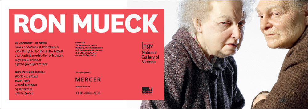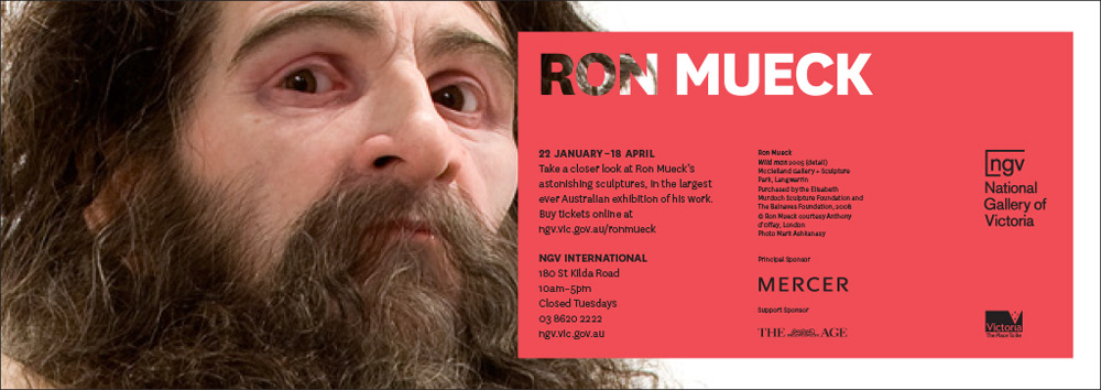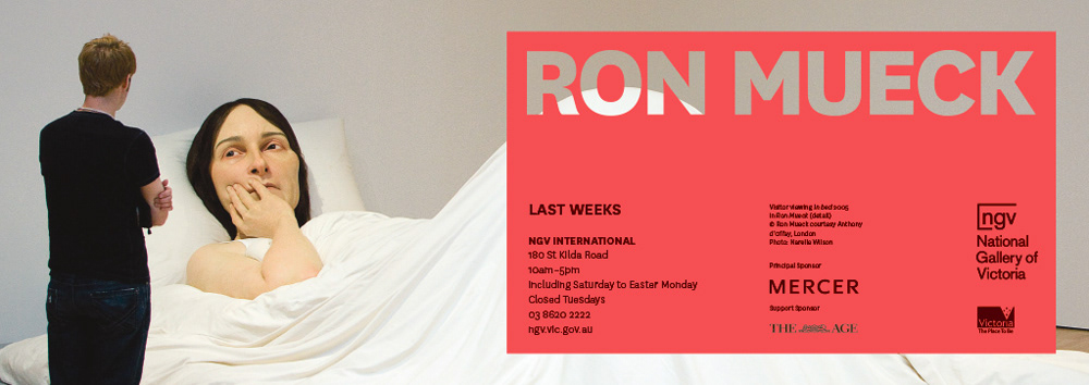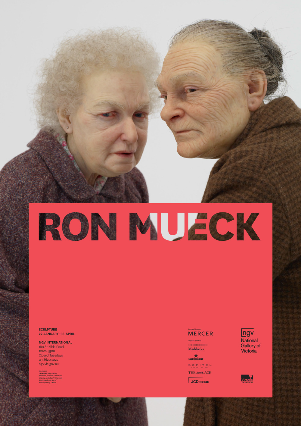 Art Direction and design of the 'Ron Mueck' exhibition identity, marketing and merchandise campaigns. Chosen as both brand package and invitation category winner at the Museums Australia Multimedia and Publication Design Awards, 2010.